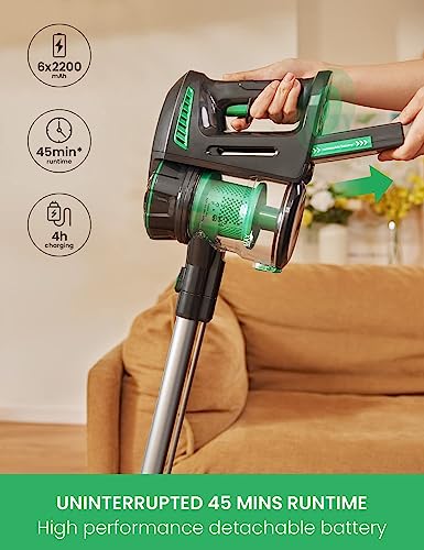 • โญใ€๐‘๐ž๐ฆ๐จ๐ฏ๐š๐›๐ฅ๐ž ๐๐š๐ญ๐ญ๐ž๐ซ๐ฒใ€‘The stick vacuum comes with a built-in 6-cell, 2200mAh rechargeable lithium battery that provides up to 45 minutes of continuous running time for daily household cleaning (covering an area of 1291.67 sq ft / 120ใŽก) with just one quick 4-hour charge. The vacuum cleaner's battery is detachable and can be charged and replaced separately.