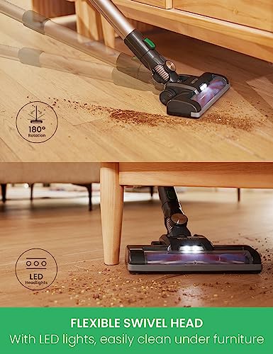 • โญใ€๐…๐ฅ๐ž๐ฑ๐ข๐›๐ฅ๐ž ๐€๐ง๐ ๐ฅ๐ž ๐จ๐Ÿ ๐‘๐จ๐ญ๐š๐ญ๐ข๐จ๐งใ€‘The ๐Ÿ๐Ÿ–๐ŸŽยฐ ๐“๐ฐ๐ข๐ฌ๐ญ๐ž๐ ๐“๐ž๐œ๐ก๐ง๐จ๐ฅ๐จ๐ ๐ฒ and 90ยฐ up-and-down angle head allows you to easily clean blind corners and hard-to-reach areas under furniture. Two LED headlights assist the cordless stick vacuum cleaner by illuminating dark places and helping to eliminate dust and debris. This gives you maximum maneuverability while cleaning.