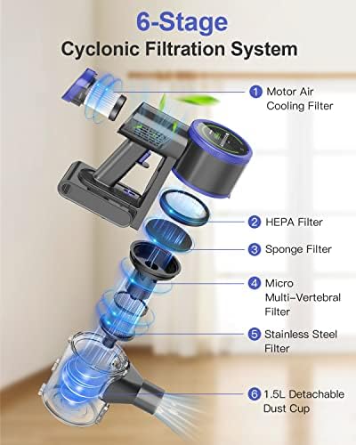 • 【6 Stages High-efficiency Filtration】With 6 stages fully sealed cyclone filtration system, the vacuum cleaner cordless captures 99.99% of fine particles as small as 0.1um and offers powerful centrifugal force to efficiently separate dirt. This rechargeable vacuum cordless provides the ultimate purified air and an excellent cleaning experience for every user. Note:the filter is washable. Regular cleaning of the filter/sponge will prevent weak suction and blockage.