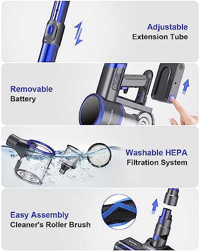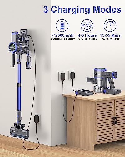 • 【55mins Long-Lasting Runtime】The stick vacuum cleaner is equipped with a 7-cell 2500 mAh large rechargeable and a detachable battery that can run for 55 minutes on standard mode and 15minutes on max mode.Three suction modes are provided for you to different occassions and time.No worry about the using time as we upgraded the vacuum with a touchable LED screen to let know well of the battery situation and vacumm health condition.