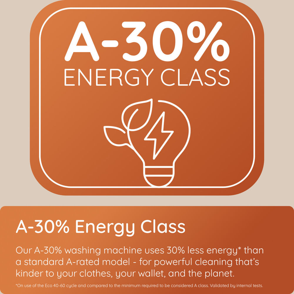 With an impressive A-30% energy rating, this washing machine uses significantly less energy than standard A-rated models. It delivers excellent cleaning performance while helping reduce energy bills and environmental impact.