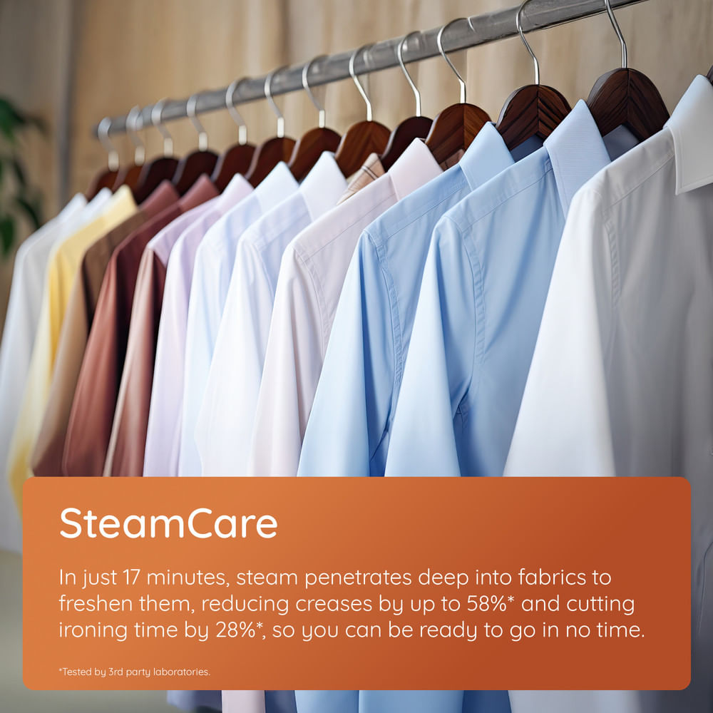 SteamCare is ideal for items that don’t need a full wash but could benefit from freshening up. Steam penetrates deep into fabrics to reduce odours and soften fibres, helping cut down creases and ironing time while using less water and detergent.