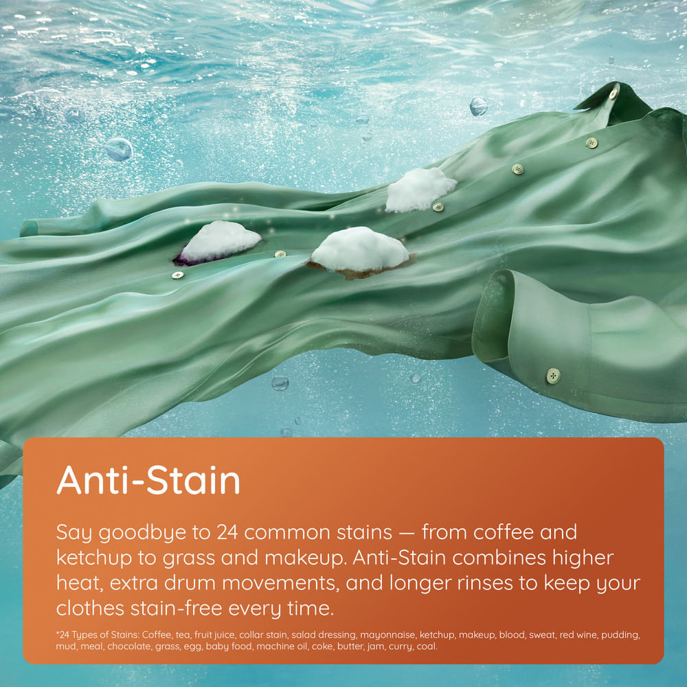 The Anti-Stain cycle is engineered to deal with a wide range of common household stains. By combining controlled heat, extra drum movements, and longer rinses, it removes tough marks effectively without the need for soaking or pre-washing, saving time and effort.