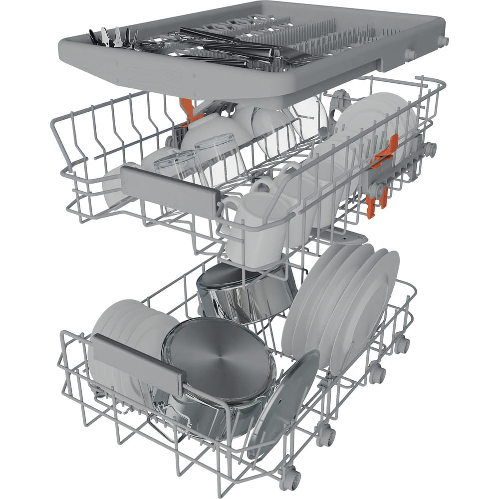 The adjustable second rack allows you to raise or lower the basket depending on your load, while the third basket adds extra capacity for cutlery and smaller items. This top rack is sliding and modular, and can be reduced to make room for larger dishes below, ensuring every wash is organised efficiently.