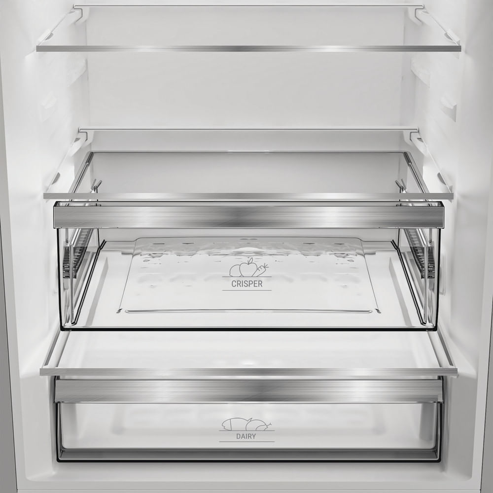 Dual No Frost technology uses two independent evaporators to circulate cool air evenly through the fridge and freezer compartments. This prevents ice and moisture build-up, eliminating the need for defrosting while protecting food from excess humidity. The result is fresher ingredients, clearer storage space, and consistently reliable cooling.