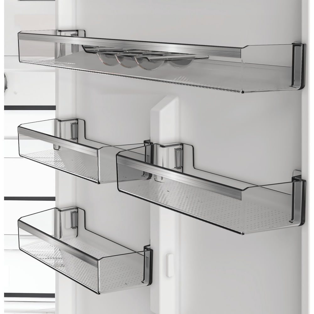 The adjustable door compartments can be repositioned to fit items of different sizes, ensuring condiments, drinks, and frequently used items are always within easy reach.