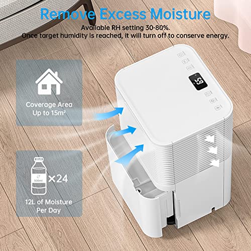 - Suitable for Space Up to 15m² - The Hangsun DL12 dehumidifier is able to collect 12L of moisture per day and adjust humidity from 30% to 80%. Once target humidity is reached, the unit will turn off to conserve energy. Perfect for use in home, basements, office, bathrooms, attics, garages, crawlspace or any large rooms up to 15m².
