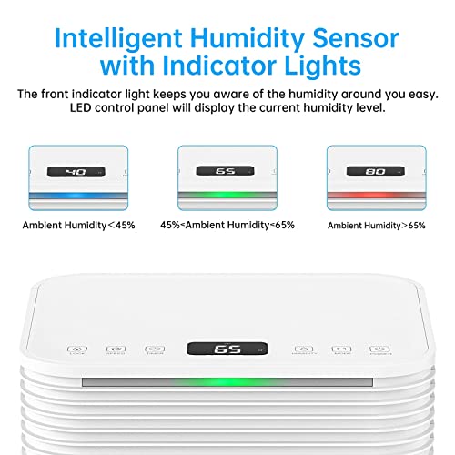 - Intelligent Humidity Sensor with Indicator Lights - The automatic humidity sensor allows you to track room humidity, LED control panel will display the current humidity level. And the smart humidity colored indicator lights keeps you aware of the humidity around you. Blue: room humidity less than 45%; Green: room humidity is an optimum 45-65%; Red: room humidity is greater than 65%.