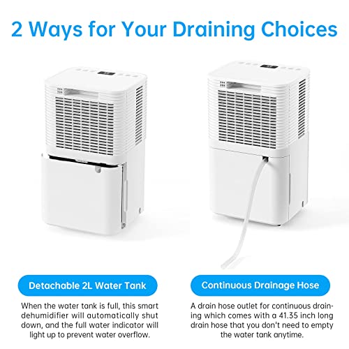 - 2 Ways for Your Draining Choices - Equipped with a large detachable 2L water tank. When the water tank is full, this smart dehumidifier will automatically shut down, and the full water indicator will light up to prevent water overflow. No time to empty it? A drain hose outlet for continuous draining which comes with a 41.35 inch long drain hose that you don't need to empty the water tank anytime.