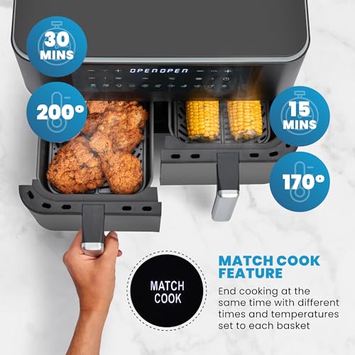• NO NONSENSE AIR FRYING: From chips and chops to burgers and bakes – you’ll be surprised at just how many delicious dishes our faff-free air fryer can handle with ease. Plus the 9L total capacity from the 2 x 4.5L baskets, there’s room for a portion for everyone.
