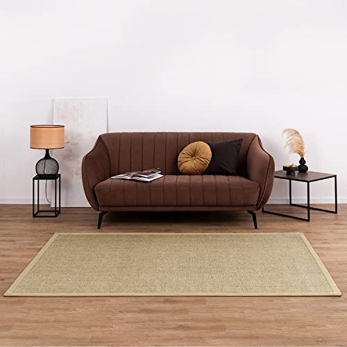Details: Natural Sisal Area Rug - Durable Woven Structure These sisal rugs have an elegant, natural look made of high-quality sisal fibres. Thanks to the strong fibres, which withstand the adversities of nature in their natural environment, the natural-coloured rugs have a high degree of durability and are able to provide lasting protection and comfort for your living area floors. A wide border, available in different versions, provides a visually attractive finish to the edges and ensures the rugs do not fray. The large size makes these rugs ideal for homes, bedrooms, and living rooms. Besides a beautiful appearance, the natural-coloured sisal rug has a high degree of functionality. Due to their moisture-binding natural fibres, the sisal carpets have the positive property of improving the indoor climate. Even owners of underfloor heating can breath a sigh of relief because the sisal carpet can be laid on heated surfaces without causing any issue. A non-slip latex backing ensures a firm grip on the floor and prevents any movement underfoot. Another advantage is that the rug is easy to care for and can be simply vacuumed to remove any dust or debris. Sisal Rug With Border - Product Features: Material: sisal Border: cotton Border size: 6 cm Backing: latex Manufacturing method: tufted Antistatic Various sizes