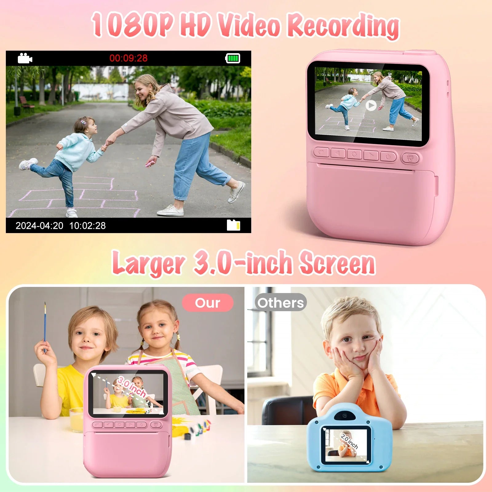 【Multifunctional Kids Instant Print Camera 】This camera with instant print, 3.0 inch large screen,1080P video, flash, time lapse, brust shooting, games, filters frame, mp3. This can meet the different needs of children. This camera provides endless hours of fun and is a great way to introduce young children to the world of photography.