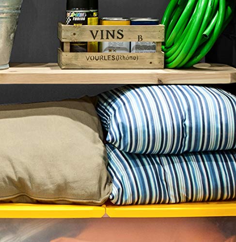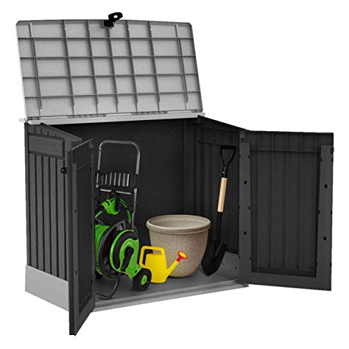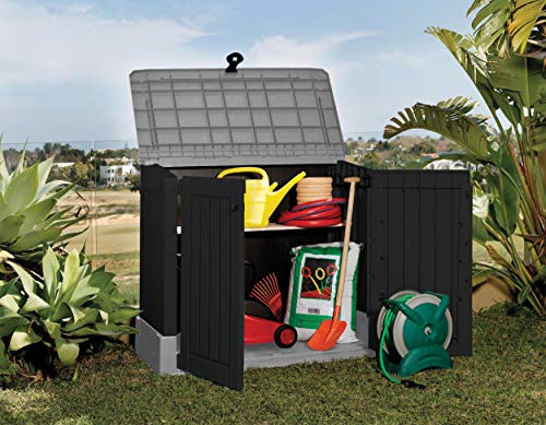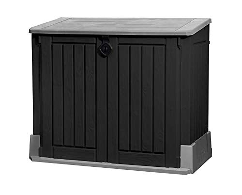Details: Store it Out MIDI The practical storage bin in wood look - great for storing a variety of garden accessories About Keter With its products, the Keter Group has been one of the leading manufacturers of plastic products for over 60 years. The core range of Keter products includes garden furniture, children's items and storage systems for household, garden and do-it-yourselfers. The Shed With a total capacity of about 0.85 m³, two waste cans with up to 120L can be stored easily. With 2 large doors and the hinged lid with integrated gas springs (there is no way that the lids can drop down), your items can be easily stowed away. The inner side walls are designed so that a wooden board (not included) can be installed as a shelf. This give you the opportunity to store small things. For extra security, the Store it Out MIDI can be locked (padlock not included). Dimensions (LxWxH): 132 x 74 x exterior about 110 cm | interior approximately121 x 64 x 104 cm The material The Store it Out MIDI is made of UV and weather-resistant, high-quality plastic (100% polypropylene) manufactured in an injection moulding process. Sun, rain and even snow cannot damage the plastic and so the Shed can be kept outdoors all year. Snow load: up to 75 kg Why you should choose a product made of plastic? We give you five reasons: Colourfast - The colours of plastic are colourfast; even after years of outdoor use, the plastic retains its beautiful colours. | Durable - The plastic items are intended for long-term and heavy use. With minimal care, you have years of enjoyment. | Weatherproof - Articles made of plastic have no problem with the blazing sun and rain. | Clean in a jiffy - Virtually maintenance free: It is enough to clean the items now and then with a mild all-purpose cleaner and a brush or just rinse them off with the garden hose every now and then. | Recycling - The plastic items are fully recyclable. Your item can take on a function at any time. This makes its impact on the environment minimal. Specifications Colour: black/grey Wood look incl. base plate Basic dimensions of the base plate: 130 x 74cm | 1.0 m 2 Dimensions with doors open: approximately105 x 95 cm Easy set up