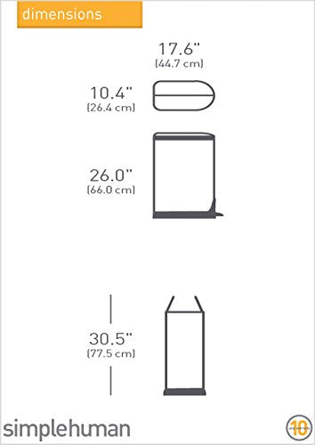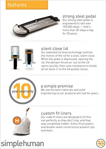 Details: Product Description The simplehuman butterfly pedal bin has an innovative butterfly lid design that opens from the centre for maximum clearance under low tabletops. The slim, space-efficient shape makes the most of tight spaces. The strong steel pedal and patented lid shox technology ensure the bin will function smoothly and quietly for years. The simplehuman code H liner fits this bin perfectly – no bunching or slipping for a cleaner experience. Legal Disclaimer 10 year simplehuman warranty. We use the best materials and solid engineering so our products will last in tough environments like your home — for years. We stand by our products. If something goes wrong, we do our best to help solve the problem.